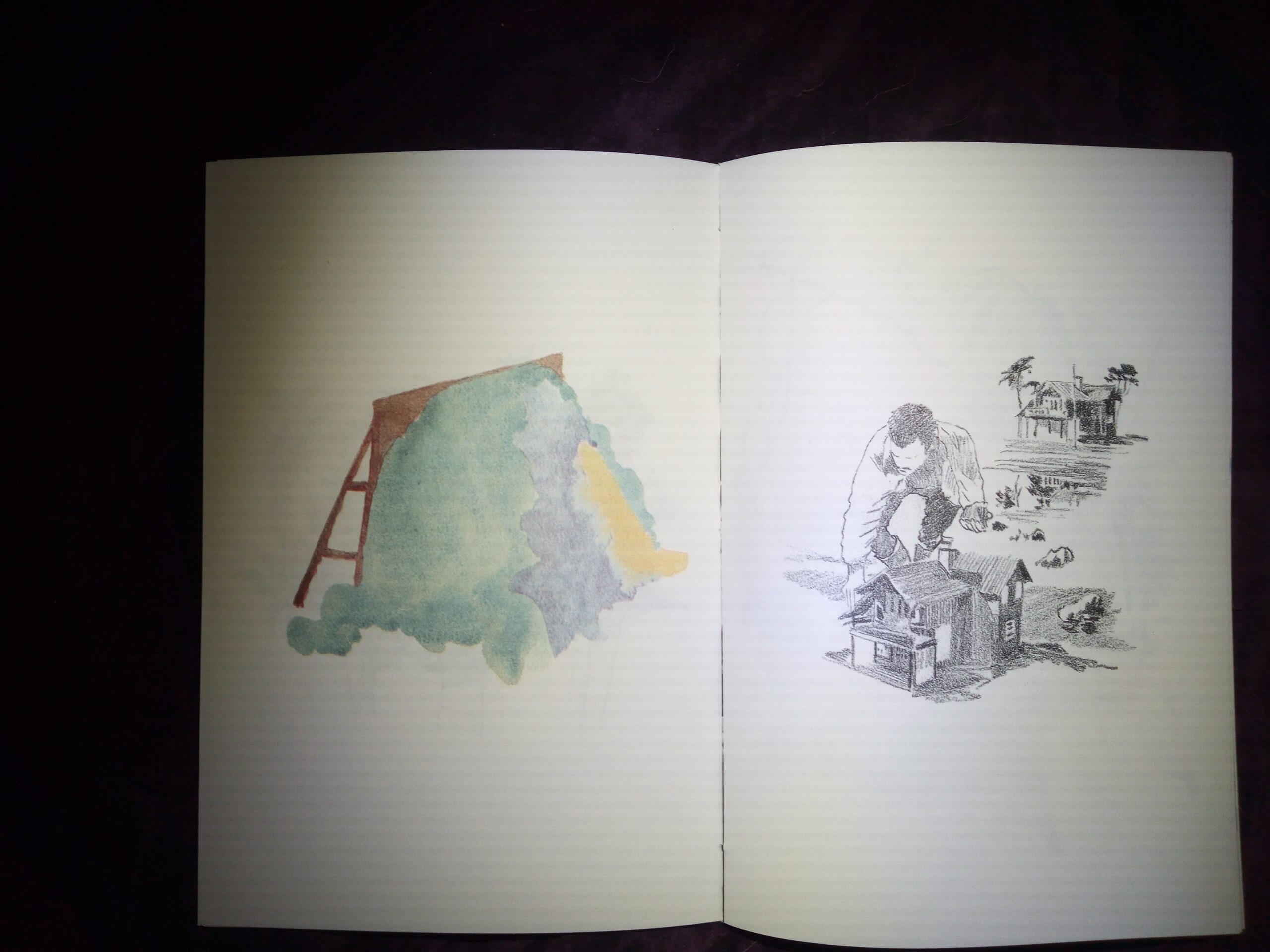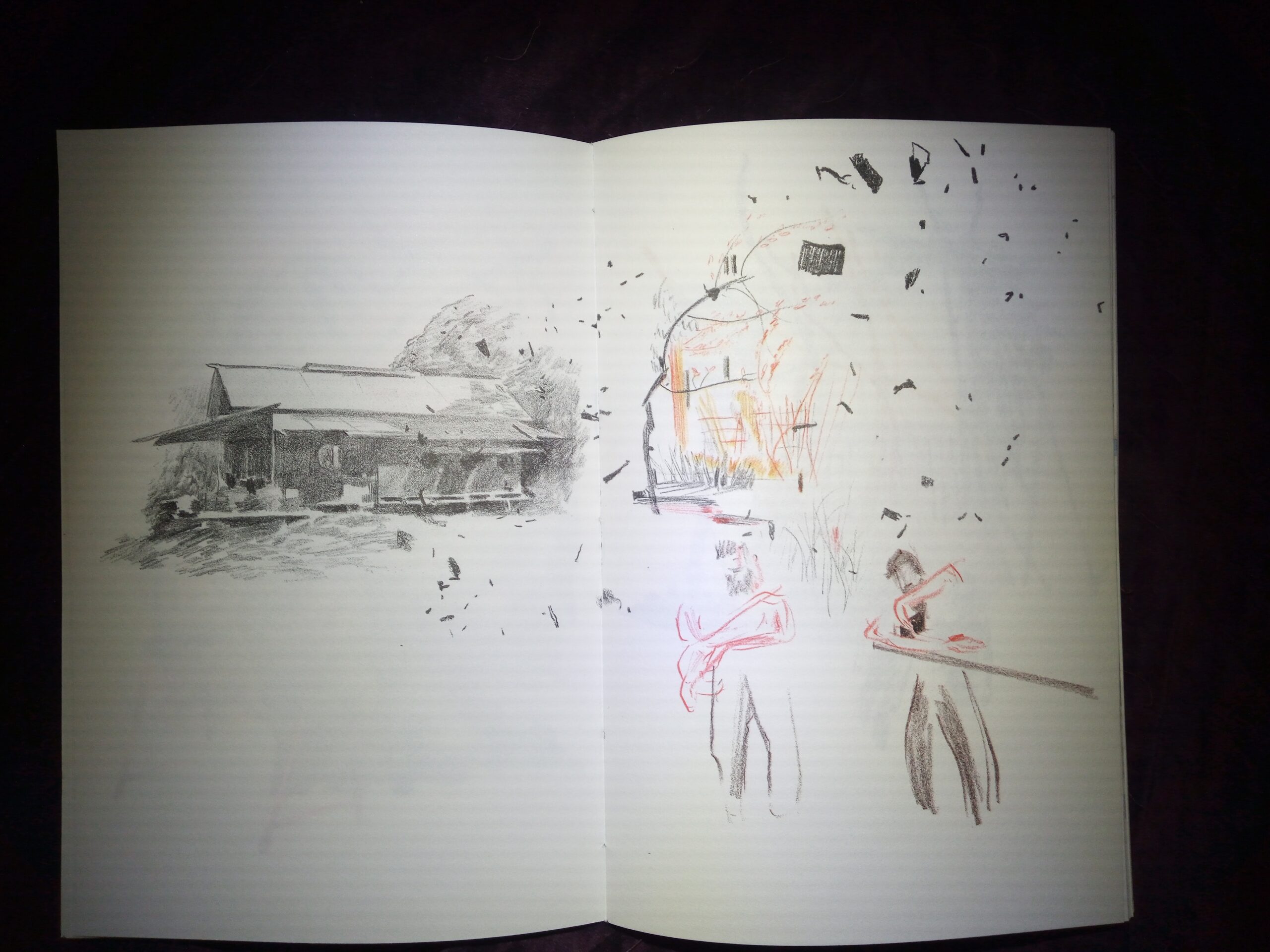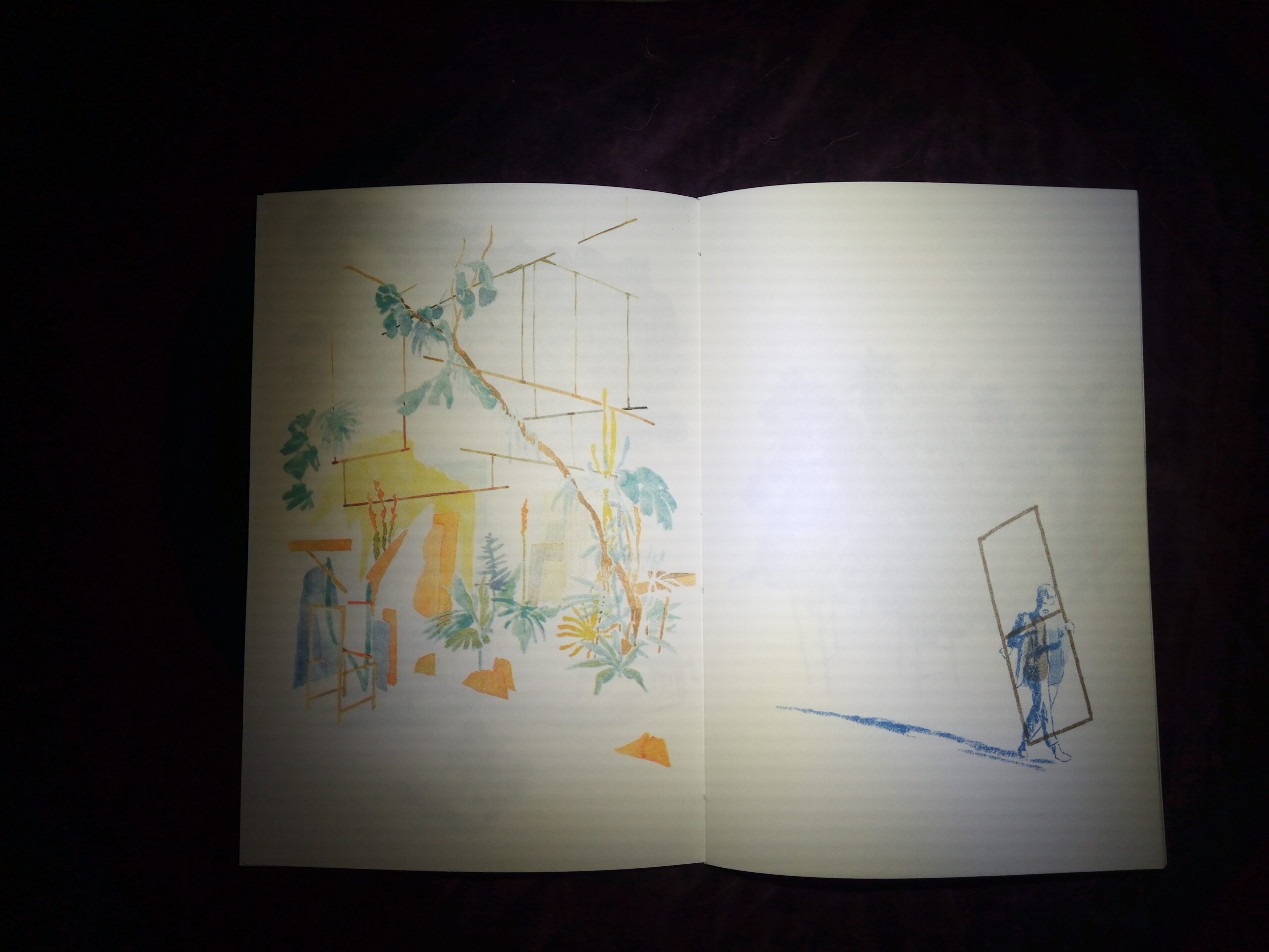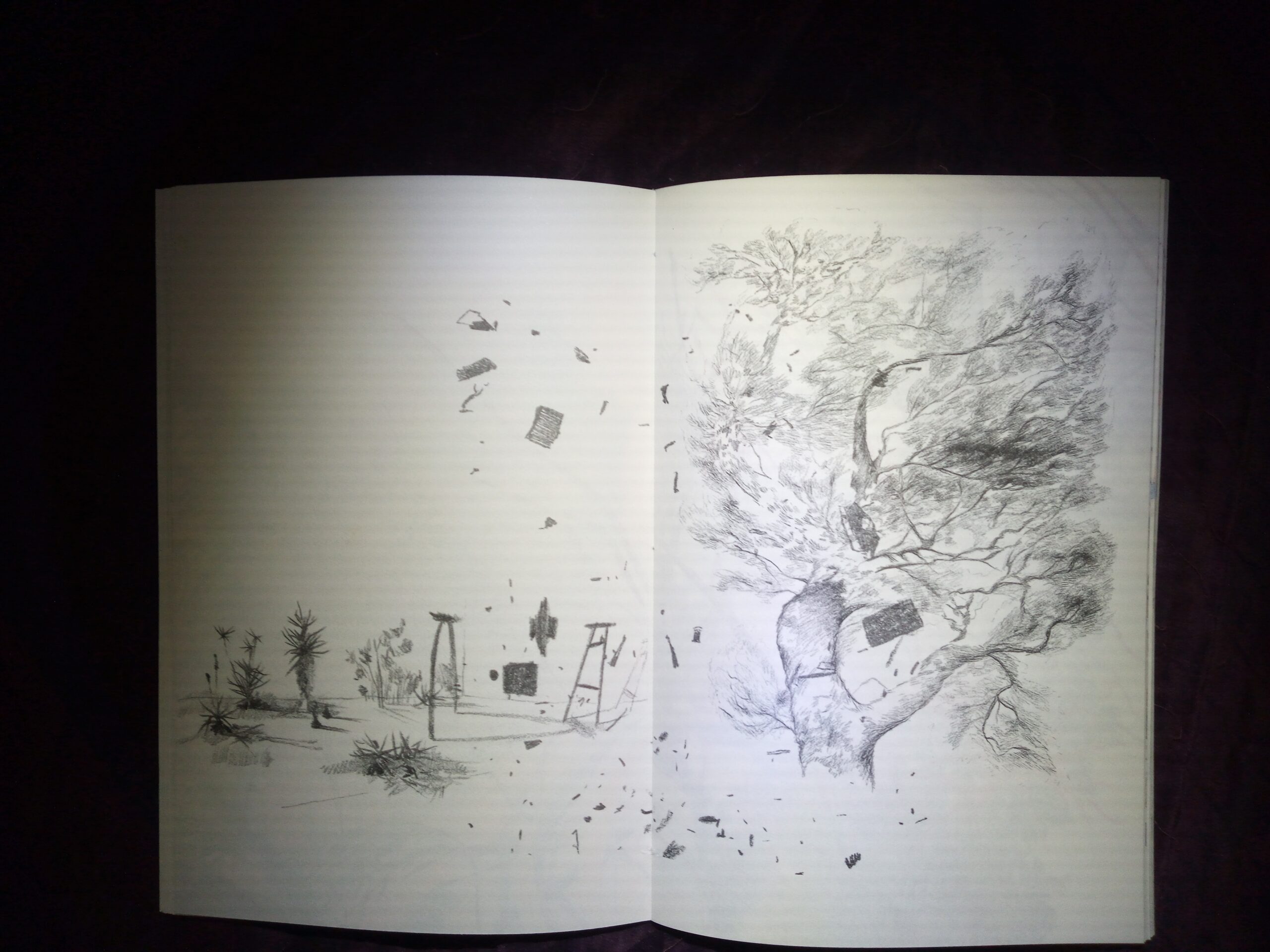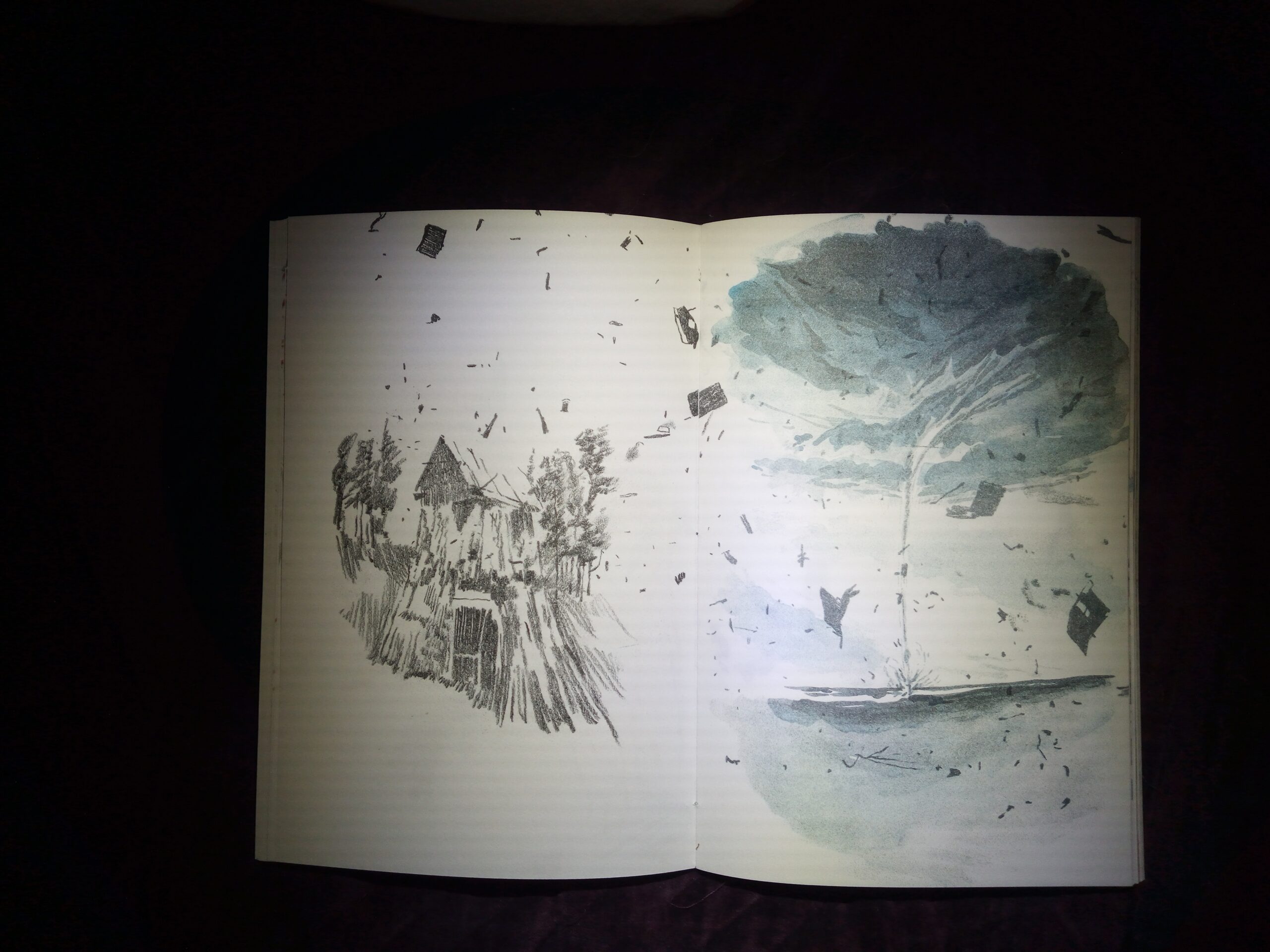 Dans ce scénario dessiné déconstruit, l’intérieur et l’extérieur ne sont jamais distincts. Le vent est omniprésent, les images, sonores, une transformation est à l’oeuvre. Est-ce le futur ou le passé, sommes-nous avant pendant ou après la catastrophe ?
