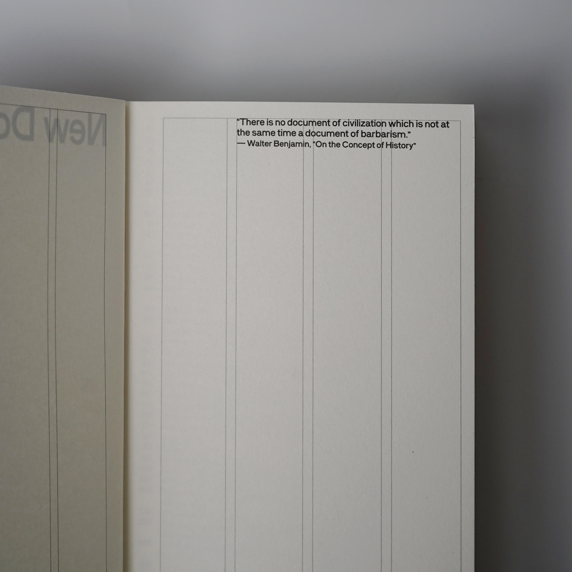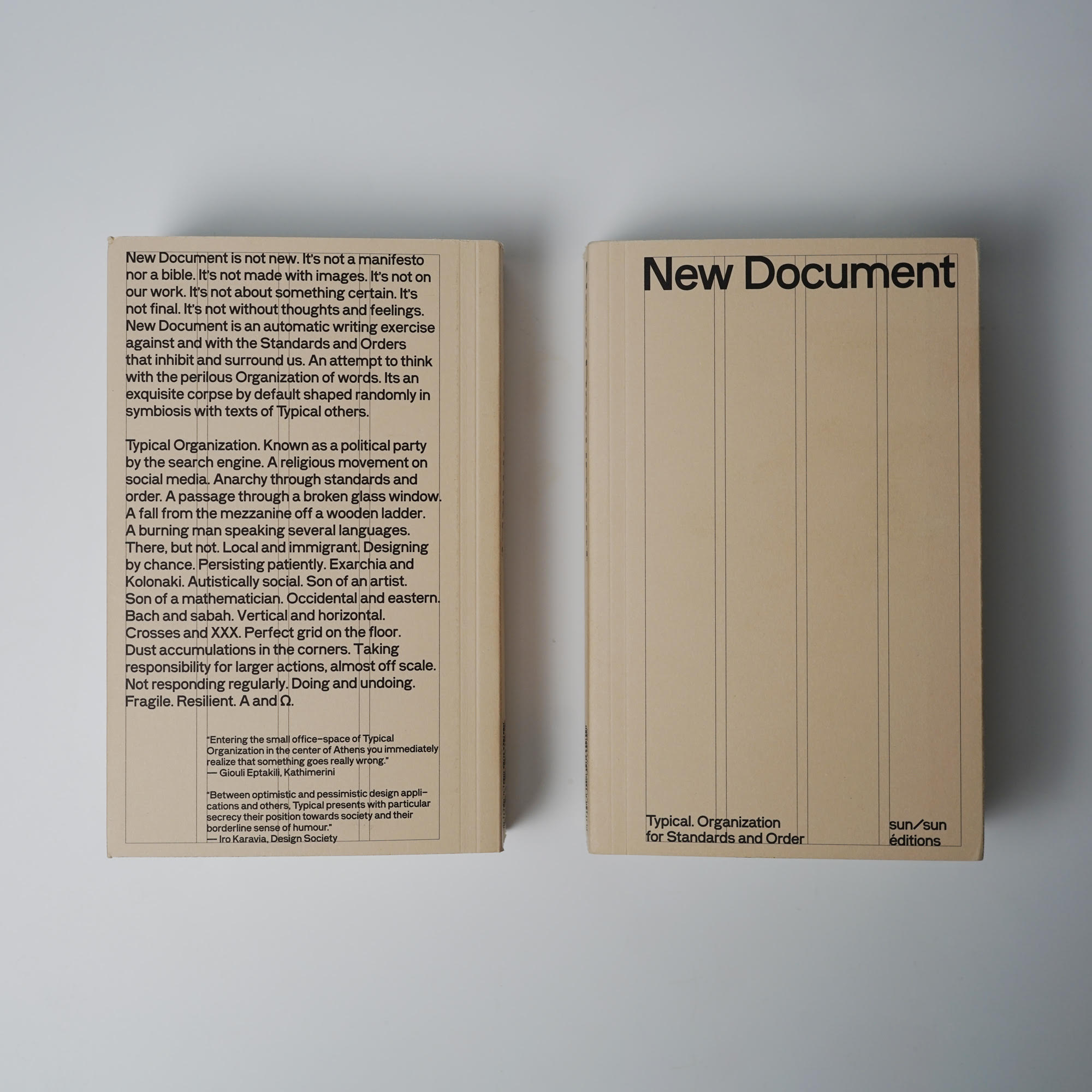 New Document n’est pas nouveau. Ce n’est pas un manifeste ni une bible. Il n’est pas fait avec des images. Il ne porte pas sur notre travail. Il ne s’agit pas de quelque chose de certain. Il n’est pas définitif. Il n’est pas sans pensées et sentiments. New Document est un exercice d’écriture automatique contre et avec les normes et les ordres qui nous inhibent et nous entourent. Une tentative de penser avec la périlleuse organisation des mots.