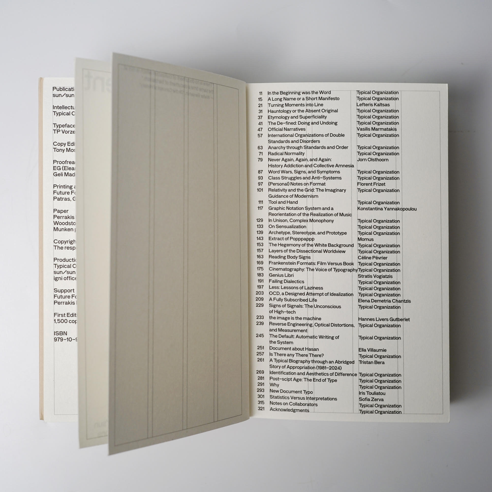 C’est un cadavre exquis par défaut façonné au hasard en symbiose avec des textes d’auteurs invités typiques : Lefteris Kaltsas, Vasilis Marmatakis, Jorn Olsthoorn, Florent Frizet, Konstantina Yannakopoulou, Momus, Céline Pévrier, Stratis Vogiatzis, Elena Demetra Chantzis, Hannes Livers Gutberlet, Ella Villaumie, Tristan Bera, Iris Touliatou et Sofia Zerva.